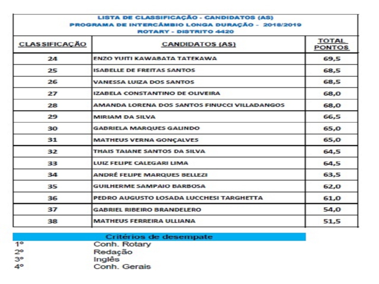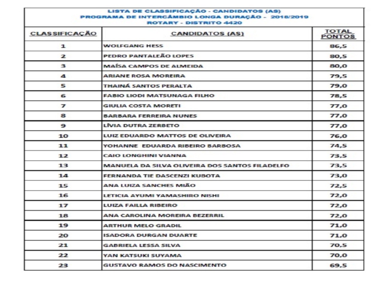 Divulgada a lista com a classificação dos jovens candidatos ao intercambio de longa duração 2018-2019 da Comissão do YEP - Distrito 4420.