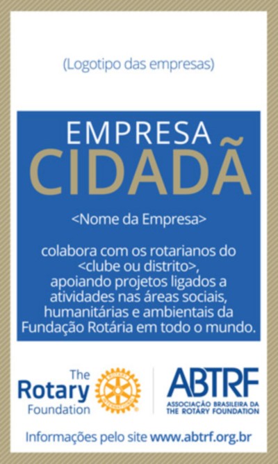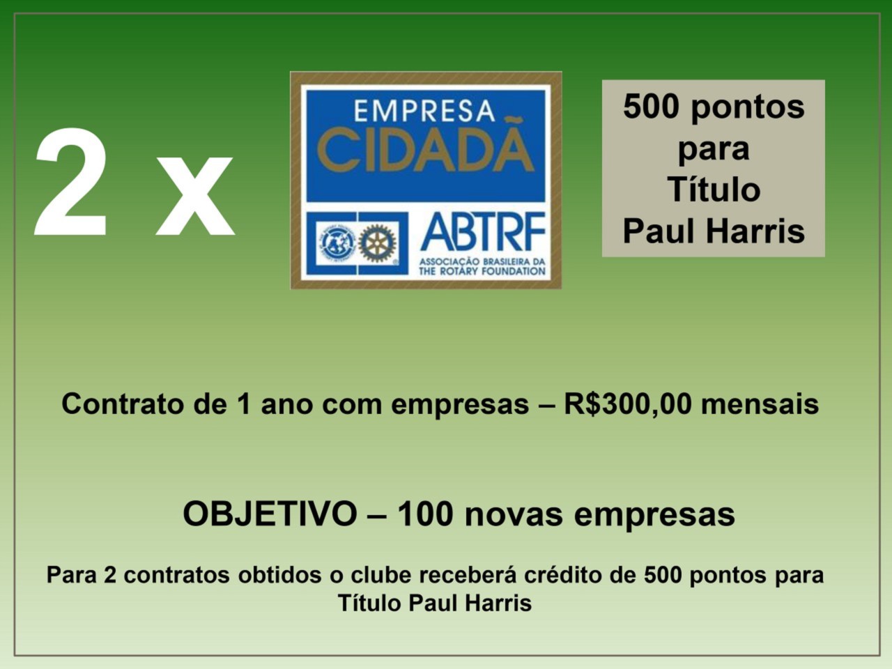 Cada Clube que obtiver duas novas Empresas Cidadãs (contrato de 1 ano com mensalidade mínima de R$ 300,00) terá um crédito de 500 pontos de reconhecimento para Título Paul Harris. O objetivo é a obtenção de 100 novas empresas em todo o Distrito.