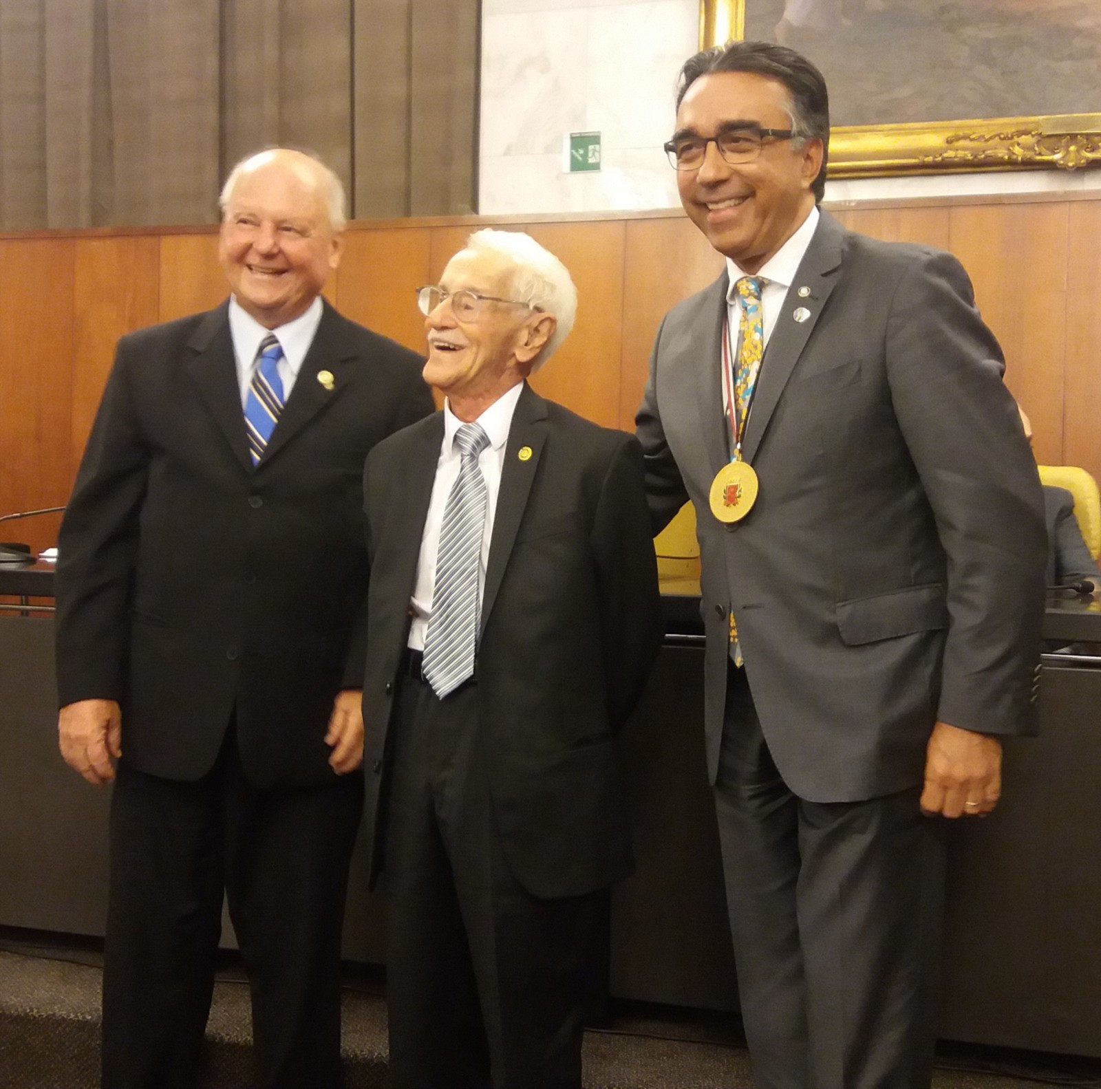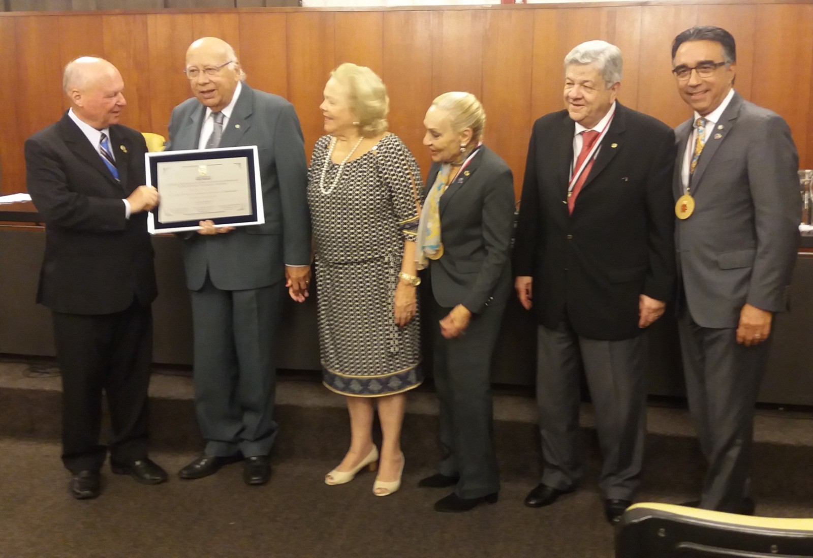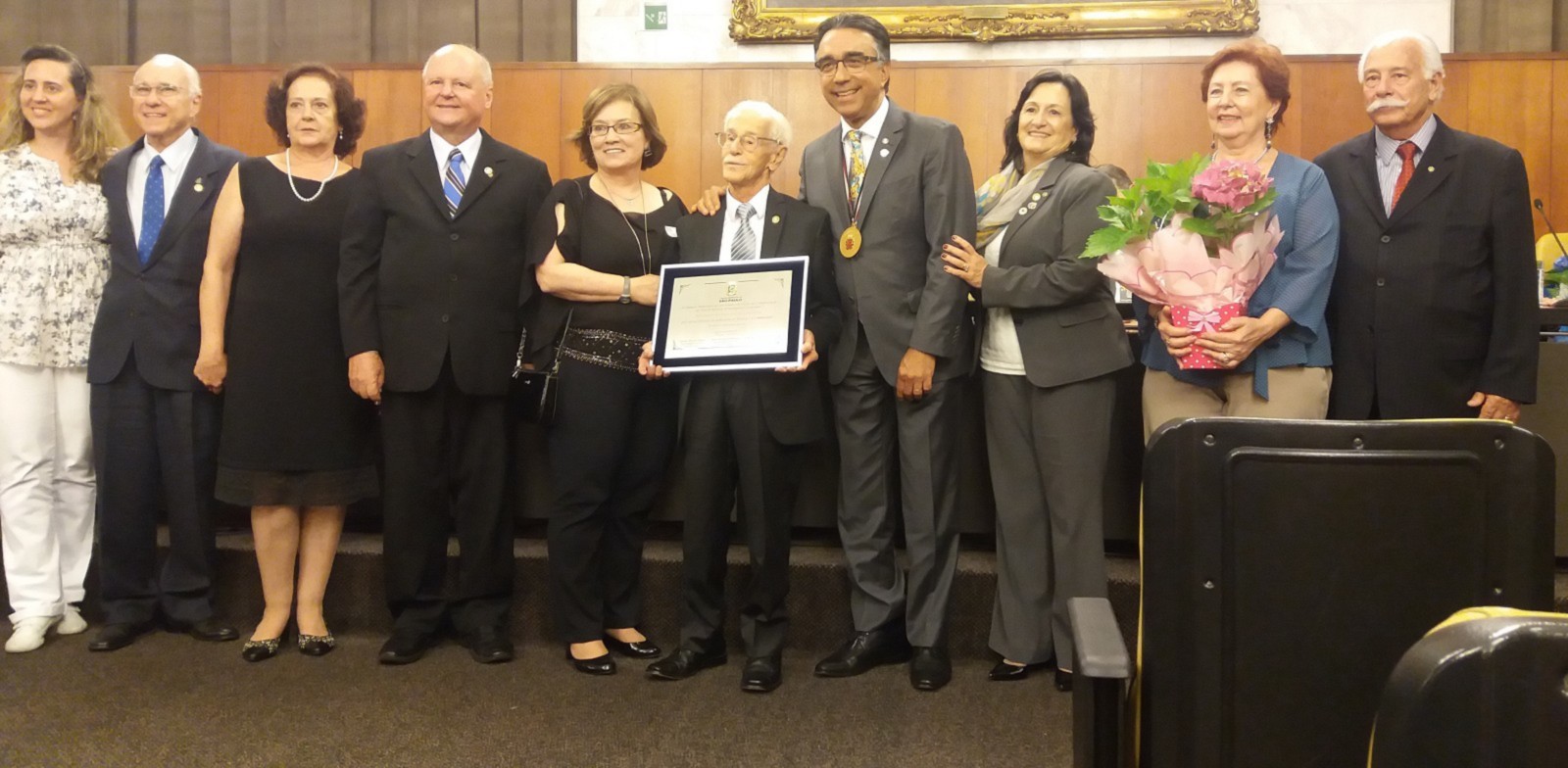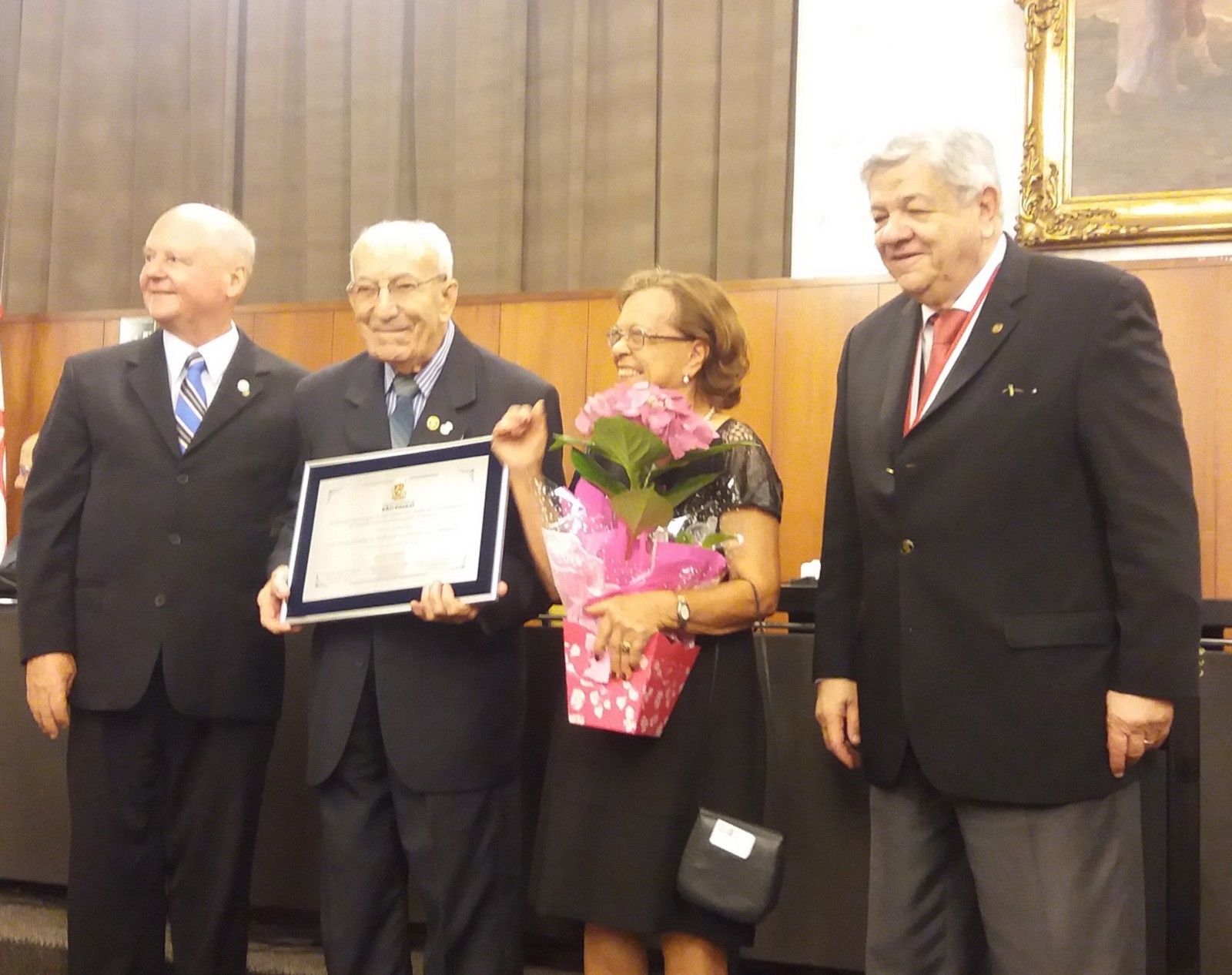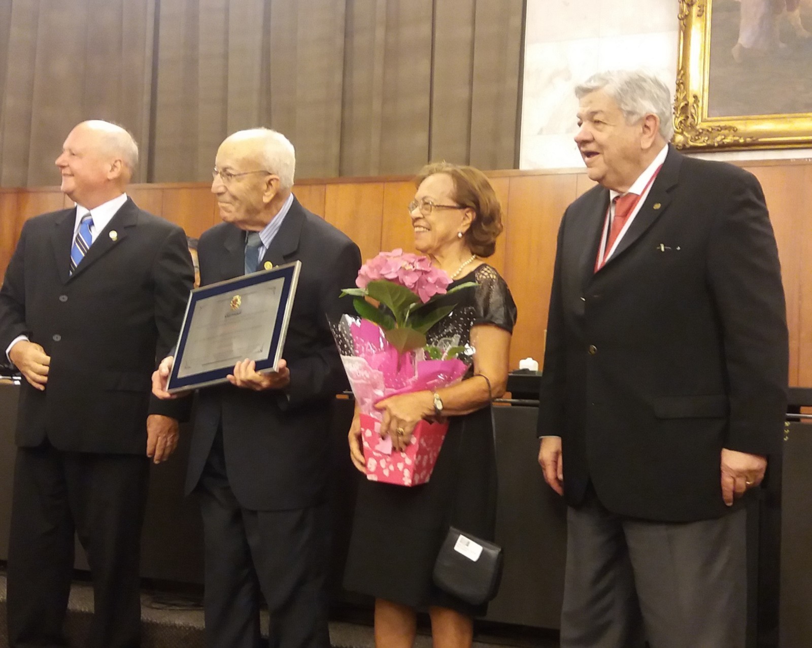 Indicado pelo Distrito 4420, o companheiro e sócio fundador do Rotary Club de Cubatão, senhor Mário Canelas, aos 93 anos, foi condecorado por sua atuação em 47 anos como rotariano. Para mim, essa é uma data muito importante, uma lembrança da Câmara Municipal que eu não esperava receber. Sou grato a esta casa e aos companheiros do meu clube, declara emocionado.
