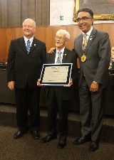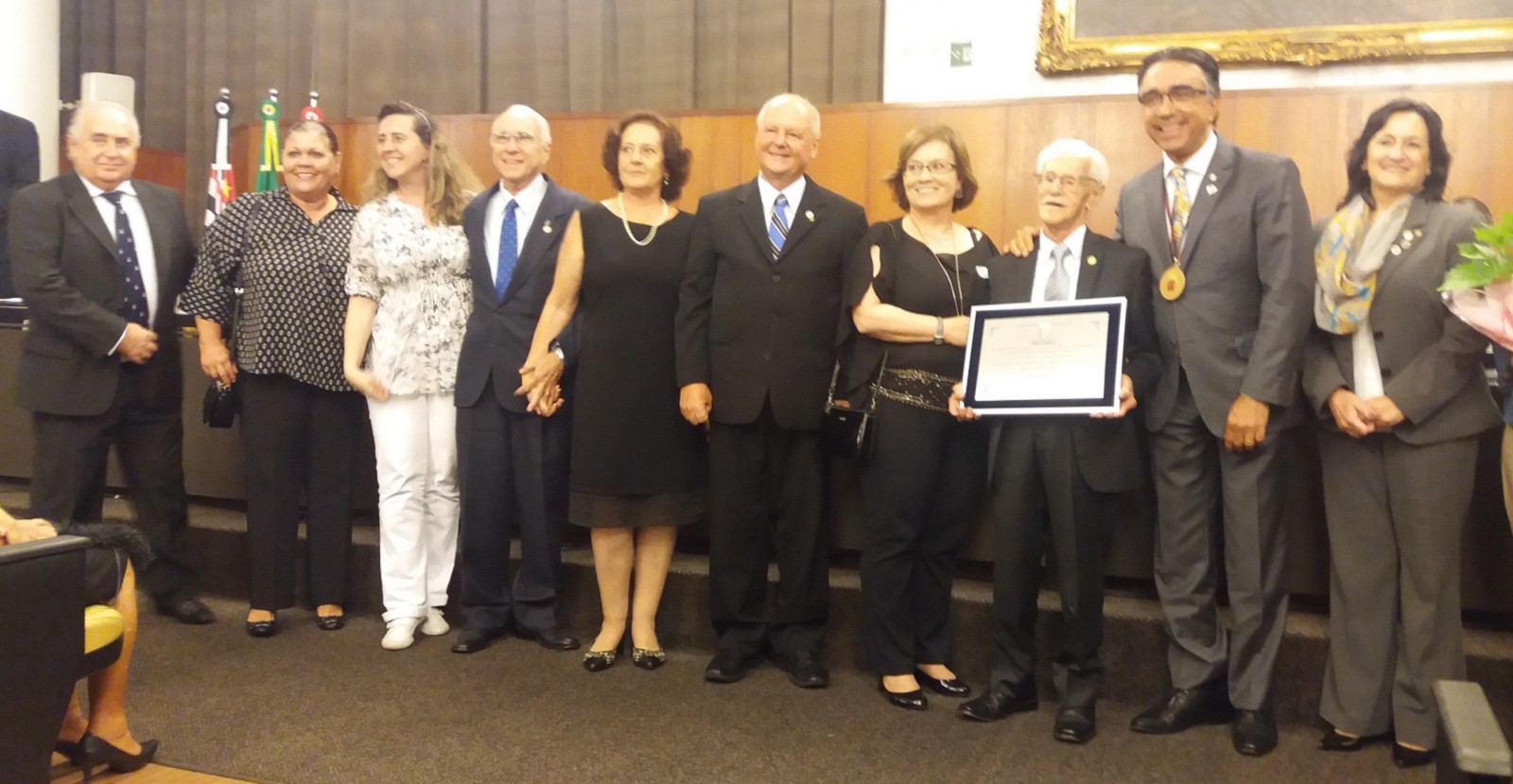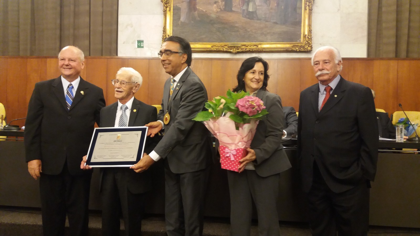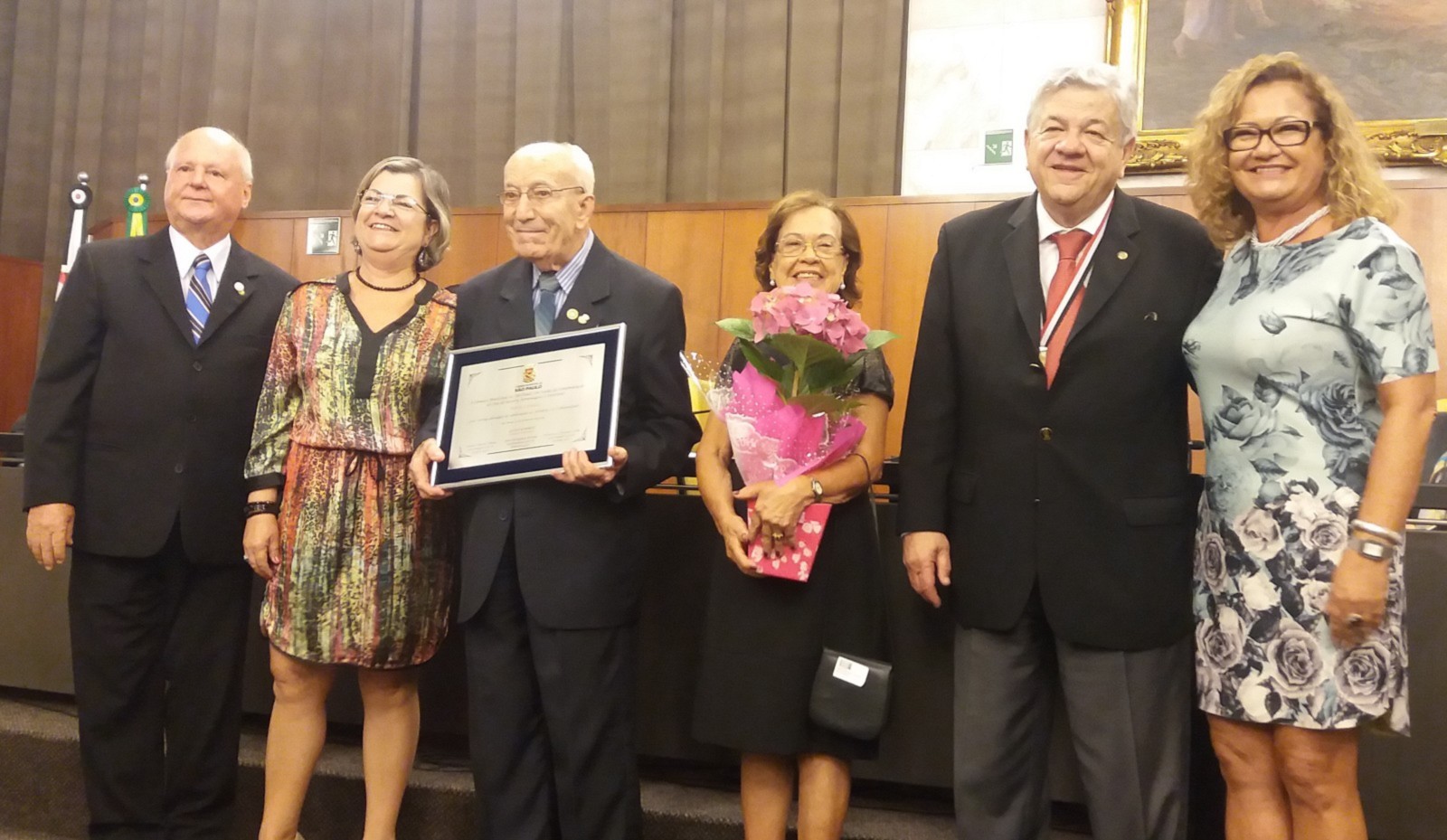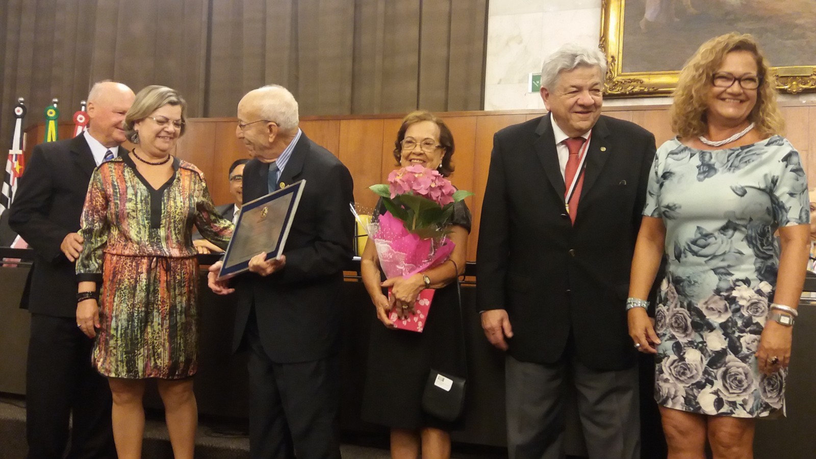 Indicado pelo Distrito 4420, o companheiro e sócio fundador do Rotary Club de Cubatão, senhor Mário Canelas, aos 93 anos, foi condecorado por sua atuação em 47 anos como rotariano. Para mim, essa é uma data muito importante, uma lembrança da Câmara Municipal que eu não esperava receber. Sou grato a esta casa e aos companheiros do meu clube, declara emocionado.