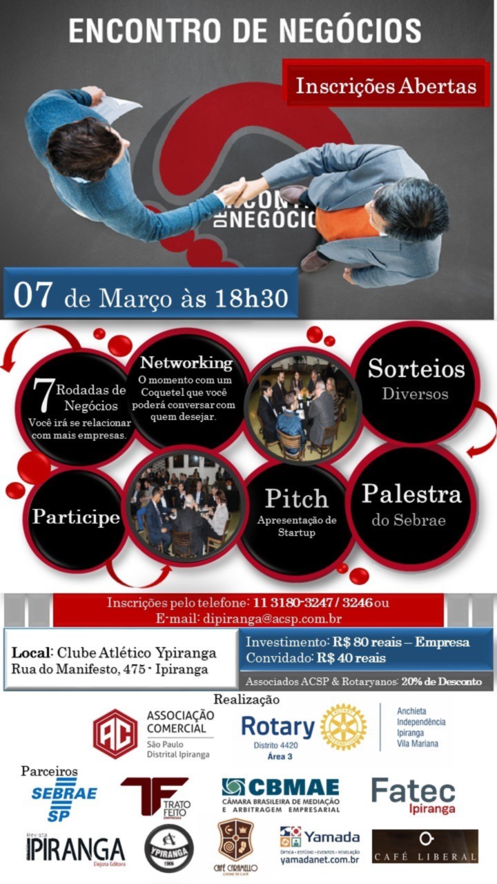 No dia 7 de março, a área 3, representada por quatro Rotary Clubs do Distrito 4420, em parceria com à Associação Comercial de São Paulo Distrital Ipiranga, realizou sua 3º Rodada de Negócios. O evento aconteceu no Clube Atlético Ypiranga, em São Paulo. Cerca de 70 pessoas participaram do evento, divididas entre 42 empresas de variados segmentos.