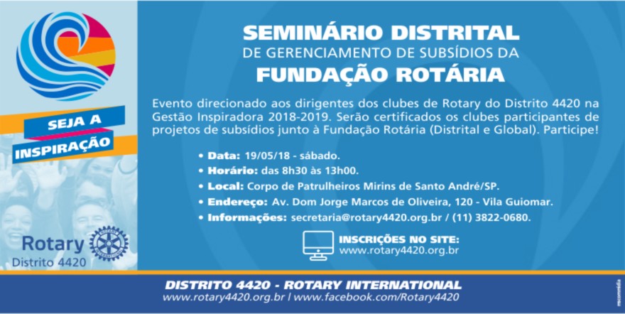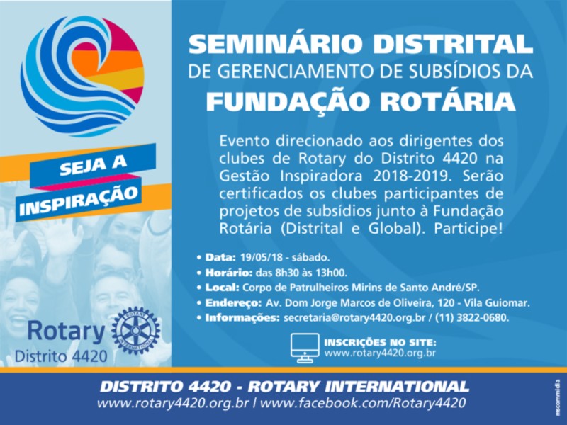 Estão convocados: Presidentes, Presidentes da Comissão da Fundação Rotária de Clubes e Governadores Assistentes do ano rotário 2018-2019.