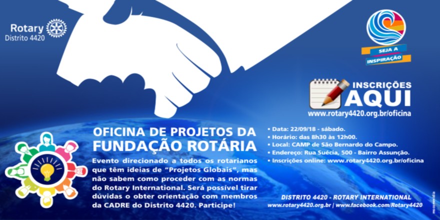 Evento direcionado a todos os rotarianos que têm ideias de Projetos Globais, mas não sabem como proceder com as normas do Rotary International. Será possível tirar dúvidas o obter orientação com membros da CADRE do Distrito 4420. Participe!