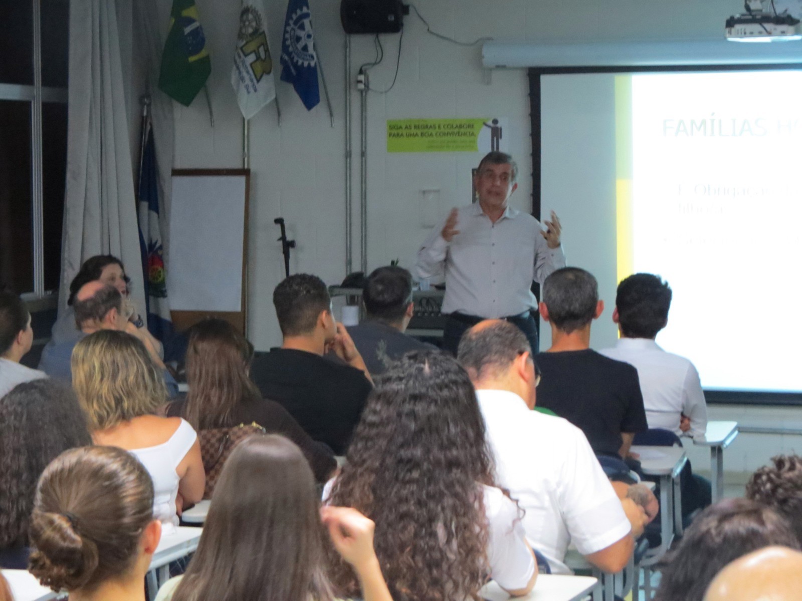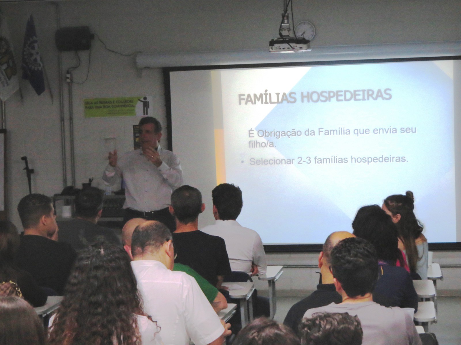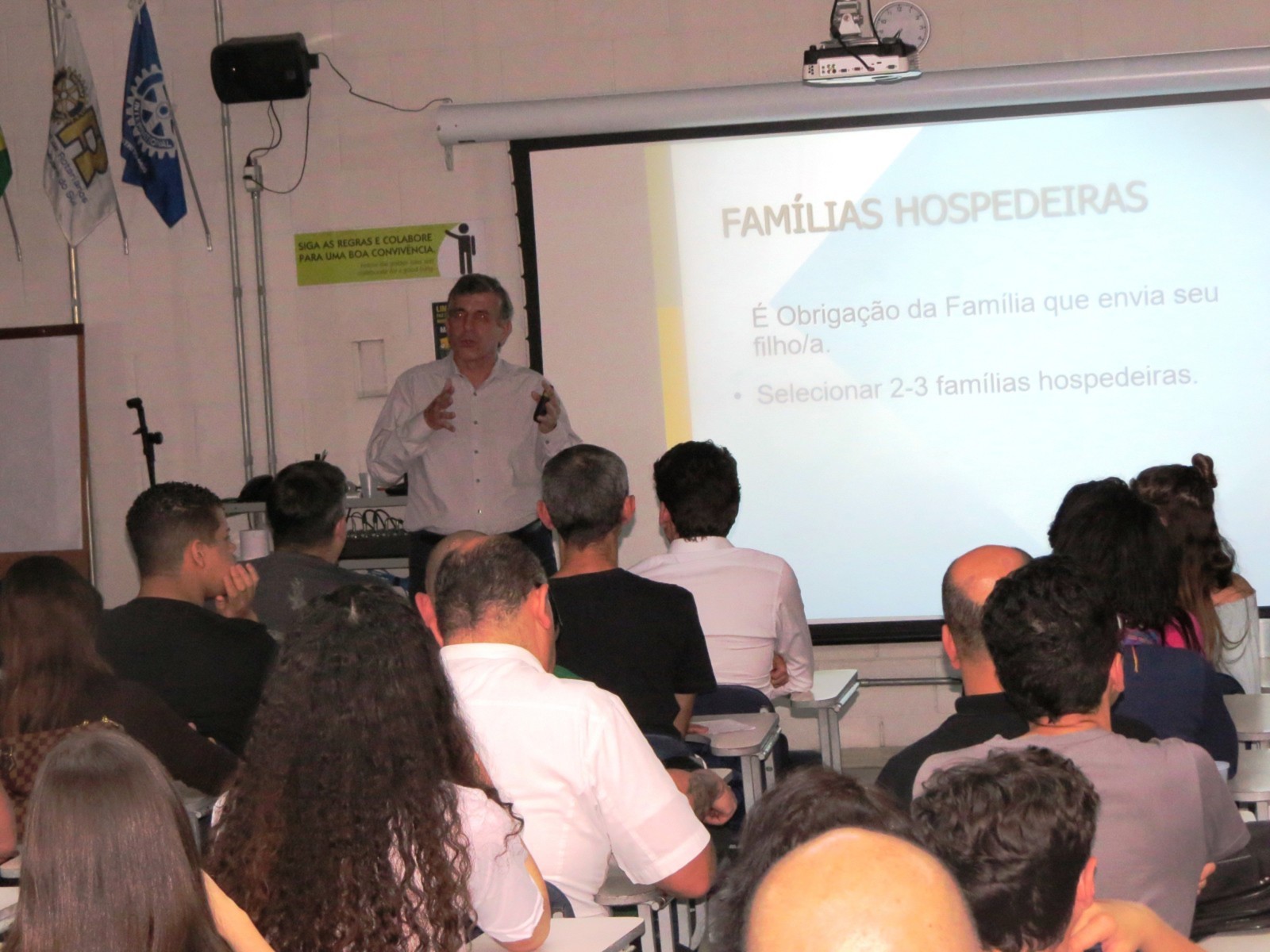 Mais de 120 pessoas, que lotaram a sala Multimídia do Colégio Eduardo Gomes, onde se realizou o evento, tiveram a oportunidade de saber qual o real significado e a importância do Programa; seus objetivos; Responsabilidades dos pais; Deveres do Club anfitrião e as regras; Tipos de famílias (anfitriãs e hospedeiras); Conselheiros e Oficiais de Intercâmbio (quem são e o que fazem); Seguros; Regras para as Famílias; Deveres dos jovens; os 4 D (dont) e os 6B (be); Benefícios; Prazos; Processo seletivo classificatório; Custos; Países parceiros (possibilidade de vagas).