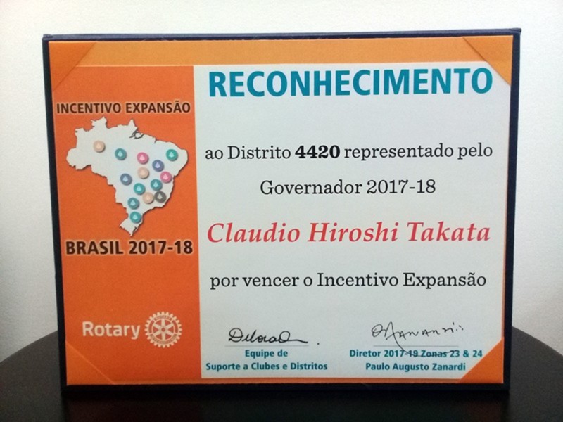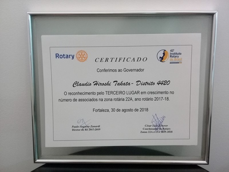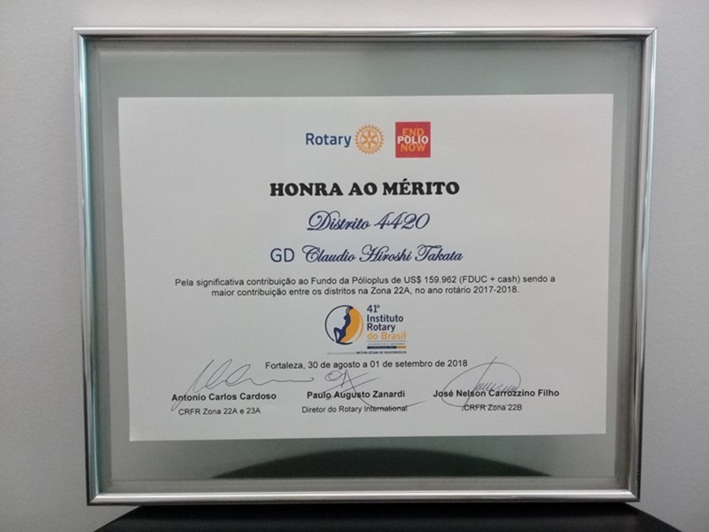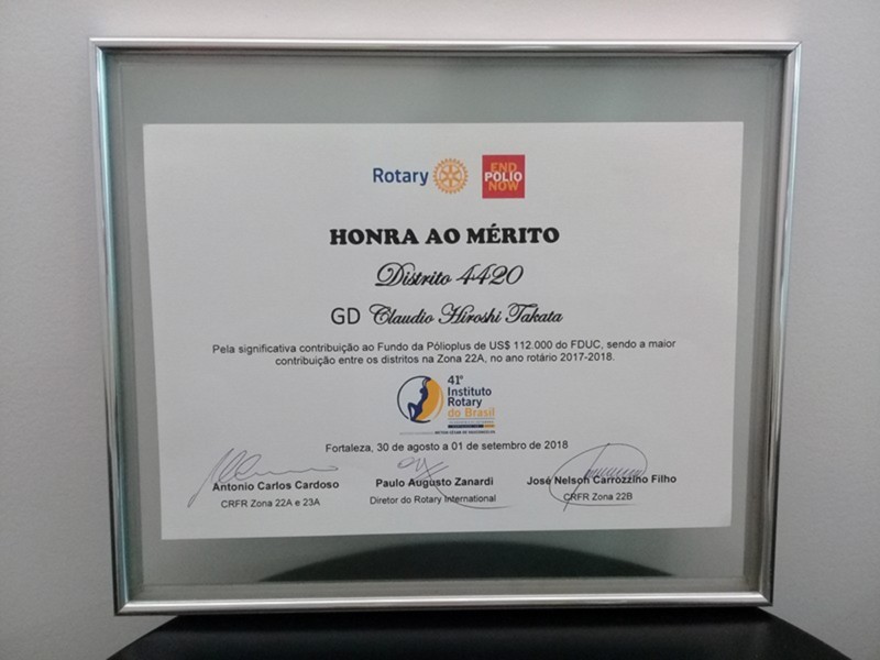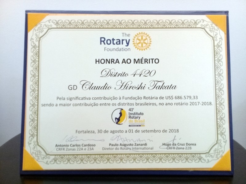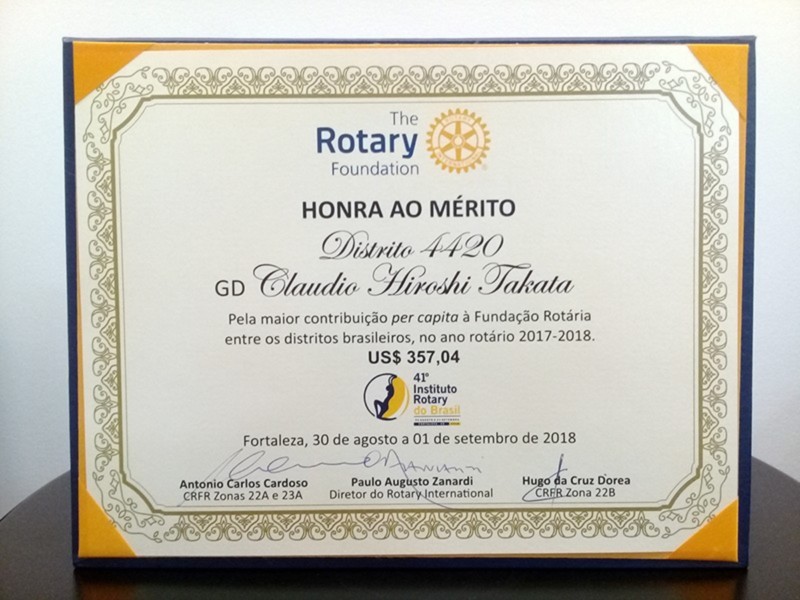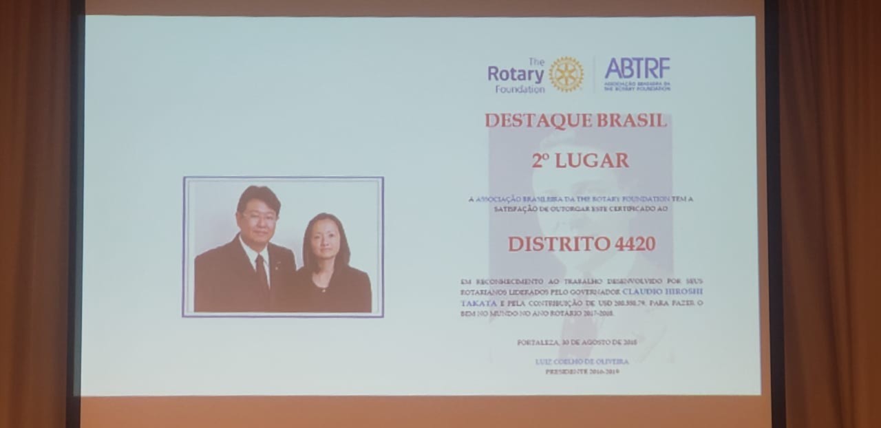 O Distrito 4420 do Rotary International foi um dos destaques do 41º Instituto Rotary do Brasil, realizado de 30 de agosto a 1º de setembro de 2018, na cidade de Fortaleza/CE. Claudio Takata, Governador Distrital no Ano Rotário 2017-2018, apresentou o programa Meu Clube é 20, durante o Seminário de Desenvolvimento de Rotary. Ele também recebeu diversos reconhecimentos pela maior arrecadação para Fundação Rotária no Brasil, maior arrecadação per-capta dos rotarianos, segundo lugar de destaque na ABTRF (Associação Brasileira da The Rotary Foundation), presença entre os distritos que doaram 20 do FDUC (Fundo Distrital de Utilização Controlada) para o programa Polio Plus, maior FDUC por zona e maior FDUC+Cash. Para fechar com chave-de-ouro a participação do Distrito 4420, Takata ainda recebeu o troféu Paulo Viriato Corrêa da Costa, laureado pela maior contribuição à Fundação Rotária entre os clubes brasileiros de Rotary no período 2017-2018. O troféu é de posse transitória por um ano e sua concessão sempre ocorre no Instituto Rotary do Brasil. Confira as fotos!