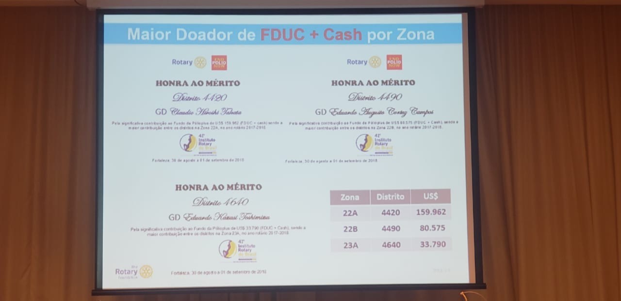 ? Contribuição ao Fundo Polio Plus de US$ 159.962,00 - FDUC + cash (maior contribuição entre todos os distritos brasileiros).