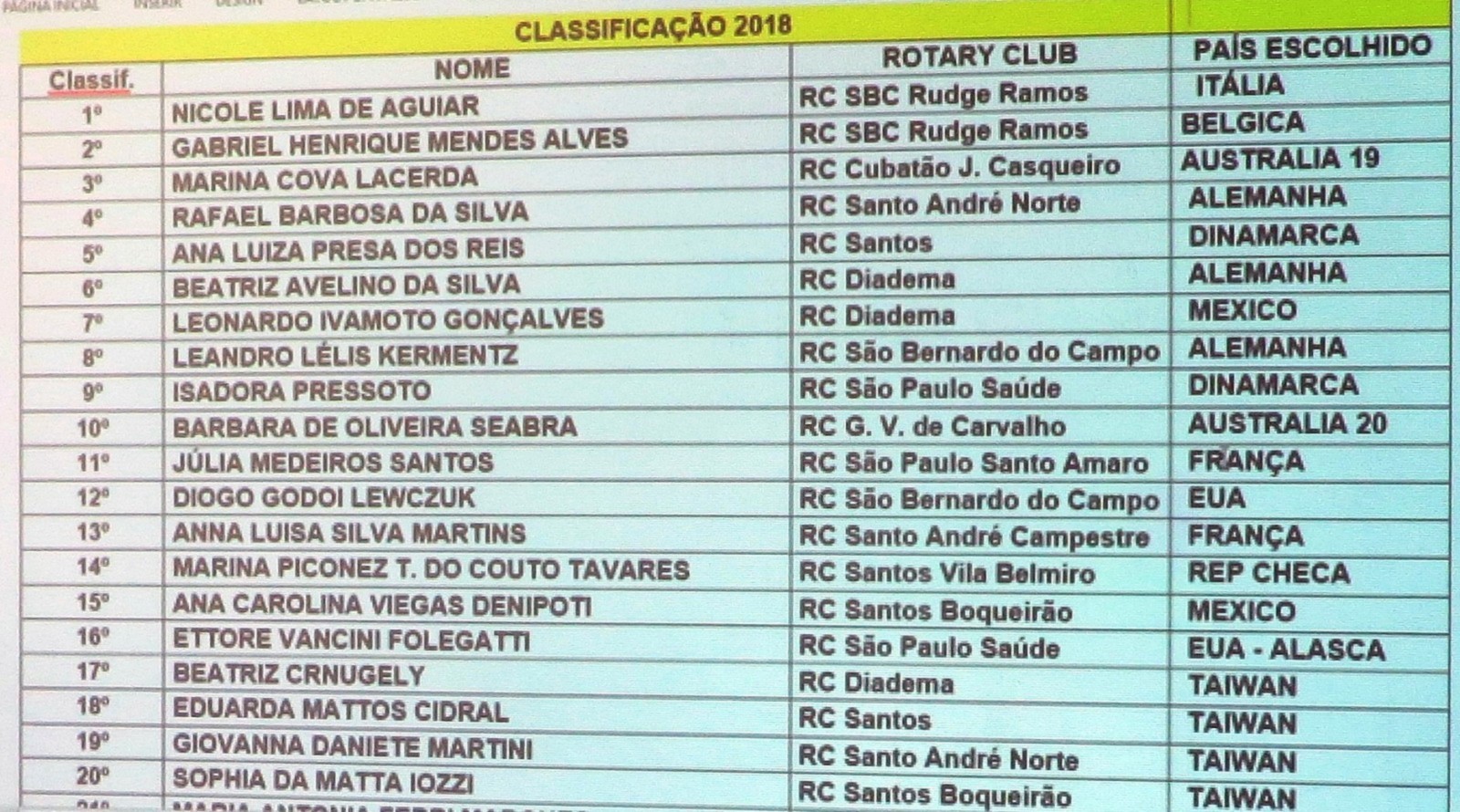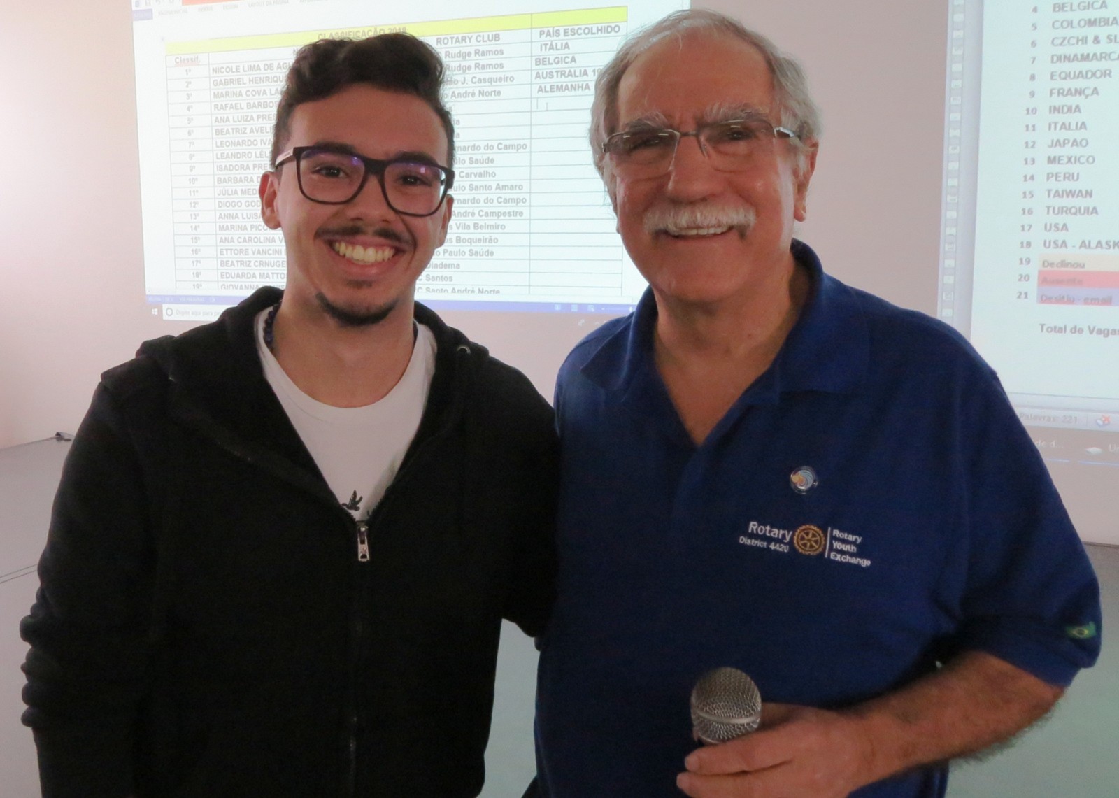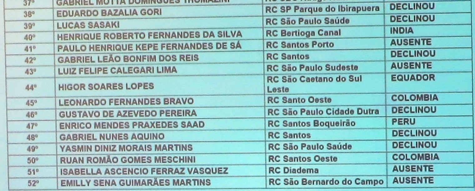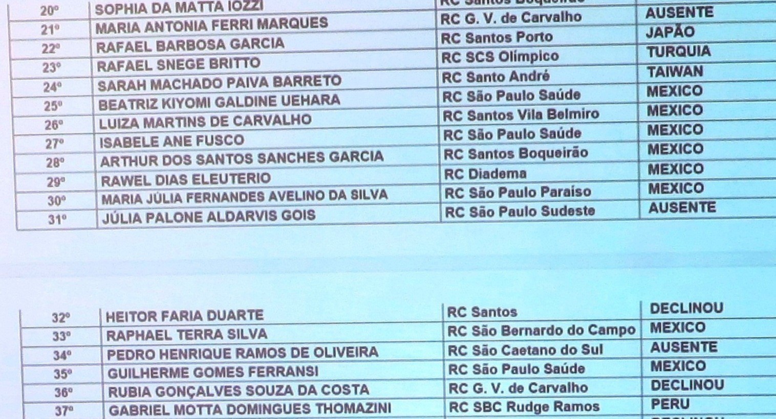 A primeira classificada no procedimento classificatório, foi a jovem Nicole Lima de Aguiar, do RC São Bernardo do Campo Rudge Ramos, que escolheu a ITÁLIA; o segundo, Gabriel Henrique Mendes Alves, do RC São Bernardo do Campo Rudge Ramos, BÉLGICA; a terceira, Marina Cova Lacerda, do RC Cubatão Jardim Casqueiro, AUSTRÁLIA; o quarto, Rafael Barbosa da Silva, do RC Santo André Norte, ALEMANHA; ao quinta, Ana Luiza Presa dos Reis, do RC Santos,DINAMARCA; a sexta, Beatriz Avelino da Silva, do RC Diadema, ALEMANHA, o sétimo, Leonardo Ivamoto Gonçalves, do RC Diadema, MÉXICO; o oitavo, Leandro Lélis Kermentz, do RC São Bernardo do Campo, ALEMANHA, a nona, Isadora Pressoto, do RC São Paulo Saúde, DINAMARCA; a décima, Barbara de Oliveira Seabra, do RC Guarujá Vicente de Carvalho, AUSTRÁLIA; a décima primeira, Júlia Medeiros Santos, do RC São Paulo Santo Amaro, França; Diogo Godoi Lewczuk, do RC São Bernardo do Campo, EUA e assim por diante, os demais 25 jovens foram escolhendo as demais vagas, Taiwan, Rep. Tcheca, México, Japão, Turquia, Peru, Índia, Equador e Colômbia.