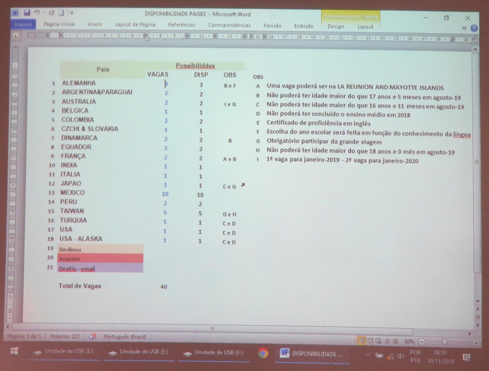 Os 52 jovens classificados no processo seletivo realizado pela Comissão do YEP no dia 18 de outubro de 2.018, tiveram a oportunidade de escolher a possibilidade de vaga para realizar seu intercâmbio de longa duração.