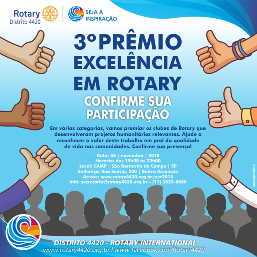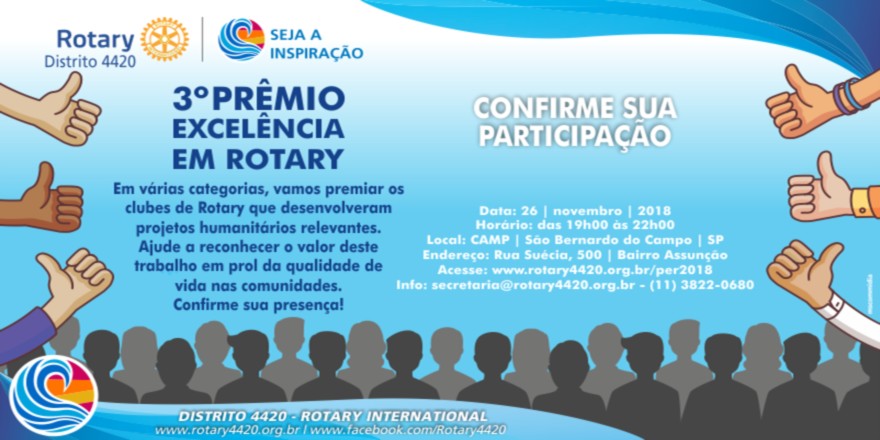 Em várias categorias, vamos premiar os clubes de Rotary que desenvolveram projetos humanitários relevantes. Ajude a reconhecer o valor deste trabalho em prol da qualidade de vida nas comunidades. Confirma sua presença!
