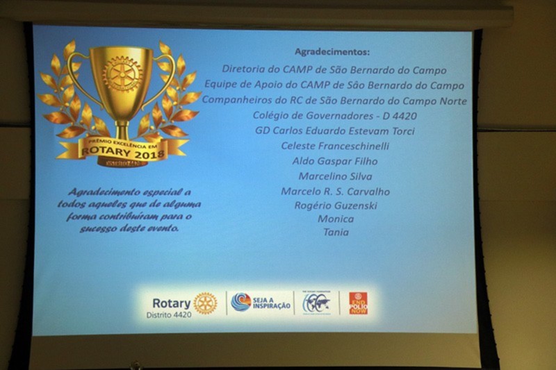 Depois dos esclarecimentos iniciais de Varella e Torci, que valorizaram o trabalho em equipe, eles também agradeceram a colaboração do CAMP SBC e a participação dos clubes inscritos no processo de seleção, classificação e anúncio dos vencedores. Coube a Adriano Valente, Governador Eleito 2019-2020 do Distrito 4420, a missão de anunciar a categoria Voto Popular. O vencedor foi o Rotary Club de Bertioga-Forte. Na categoria Projeto Distrital ? Apoio à Educação, o ganhador foi o Rotary Club de Itanhaém. O troféu foi entregue por Sérgio Lazzarini, Governador do Distrito 4420 no Ano Rotário 2008-2009.