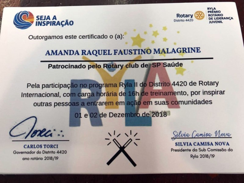 O Distrito 4420 do Rotary International realizou mais uma edição do RYLA - Rotary Youth Leadership Award (Prêmio Rotário de Liderança Juvenil). Indicados pelos clubes de Rotary, os participantes encontraram no evento uma ótima oportunidade de crescimento pessoal e direcionamento profissional. Sob a temática do ENCANTAMENTO, o RYLA 2 contemplou participantes entre 18 e 30 anos de idade. Despertar o líder que existe em cada jovem foi um dos objetivos do encontro. A ação foi realizada no fim de semana de 1 e 2 de dezembro, na colônia de férias do SindVend (Sindicato dos Empregados Vendedores e Viajantes do Comércio no Estado de São Paulo), localizada na cidade de Praia Grande/SP.