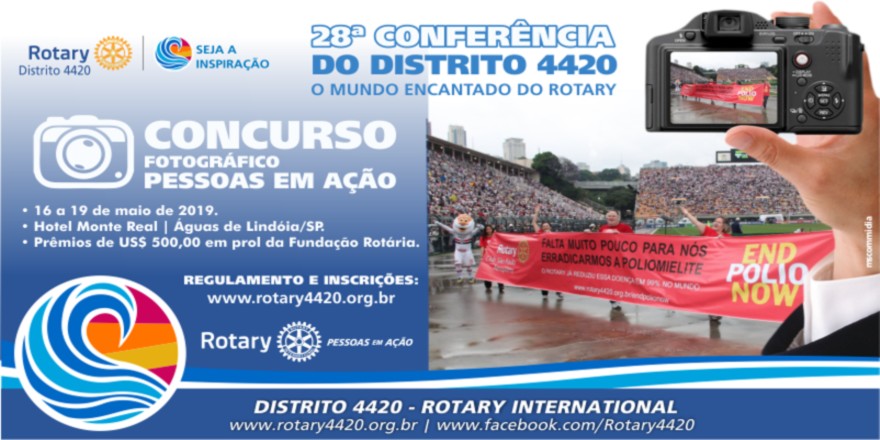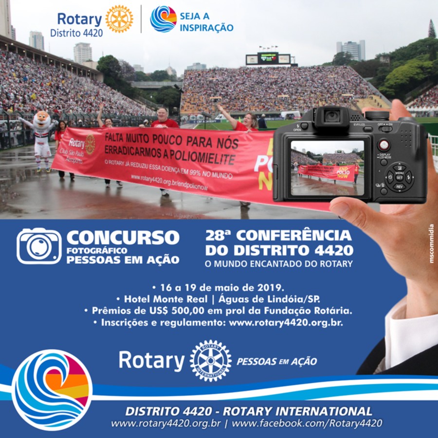 Uma das novidades na 28ª Conferência do Distrito 4420 será o Concurso Fotográfico - Pessoas em Ação. O concurso tem como objetivo a promoção da Imagem Pública do Rotary e da arte da fotografia no âmbito rotário, a partir da campanha Pessoas em Ação, contida em diversas temáticas dentro do site do Brand Center do RI. O concurso pretende mostrar diferentes visões, iniciativas e projetos que despertem o senso crítico positivo nos rotarianos e não rotarianos sobre o ideal de servir em Rotary.